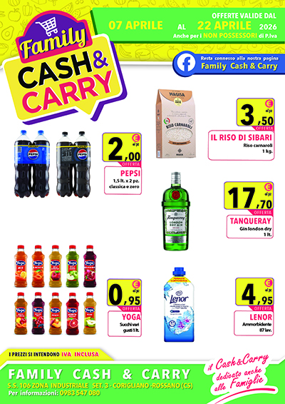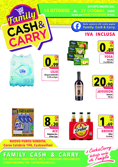 Il Family Cash & Carry è dedicato alle famiglie e alle aziende del settore Ho.Re.Ca., offrendo i prodotti dei migliori marchi e al miglior prezzo. Non temiamo confronti su qualità e risparmio. Dai un'occhiata alle offerteVolantino! Siamo a Corigliano-Rossano nei pressi del centro commerciale i Portali.