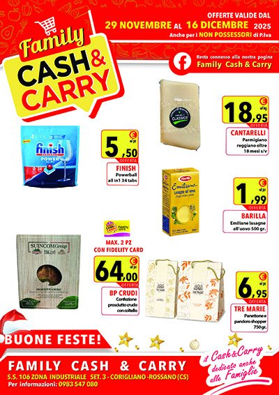 Il Family Cash & Carry è dedicato alle famiglie e alle aziende del settore Ho.Re.Ca., offrendo i prodotti dei migliori marchi e al miglior prezzo. Non temiamo confronti su qualità e risparmio. Dai un'occhiata alle offerte Volantino! Siamo a Corigliano-Rossano nei pressi del centro commerciale i Portali.